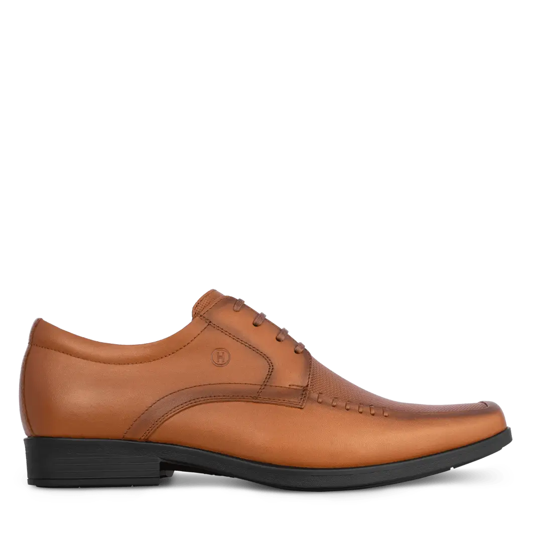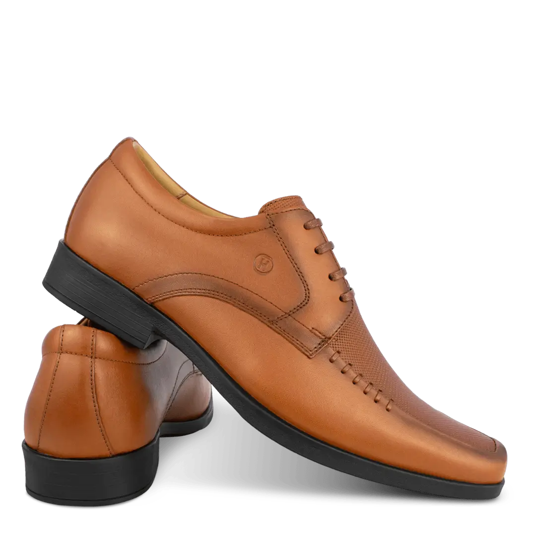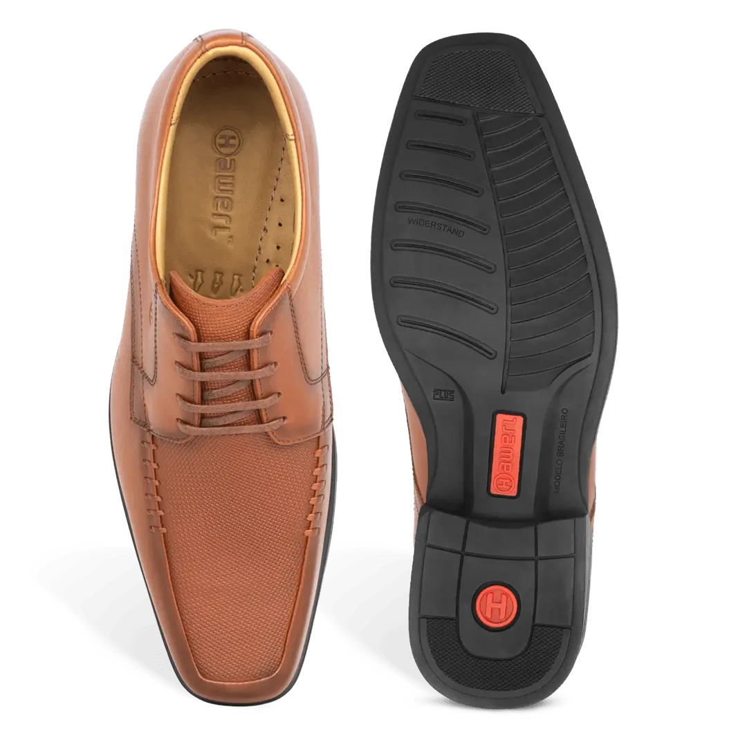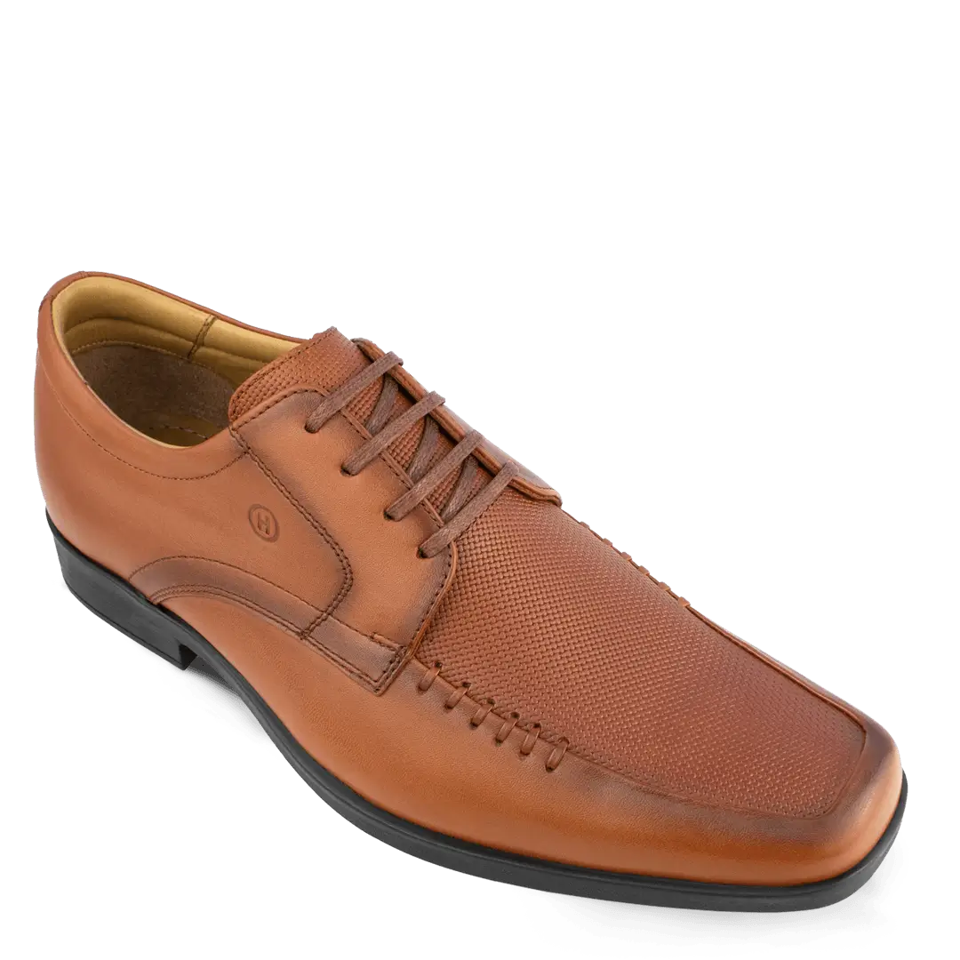 Elegancia que se nota a primera vista. Este zapato de vestir en cuero vacuno combina una silueta estilizada con empeine liso, puntera levemente afinada y cordonera de cuatro ojales para un calce perfecto. El juego entre paneles de cuero liso y cuero grabado agrega textura y car?cter, mientras las costuras finas y el logotipo sutil en relieve revelan un acabado hecho a mano. El forro de cuero badana abraza el pie con suavidad y regula la humedad, y la planta de caucho ofrece tracci?n y confort durante todo el d?a..